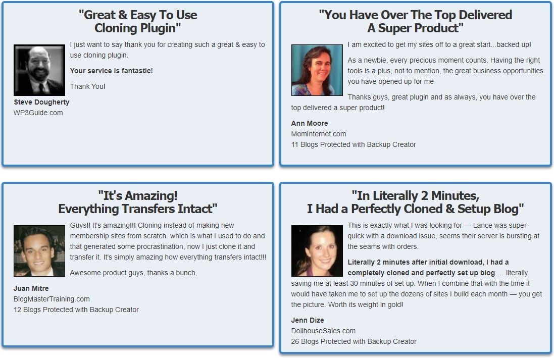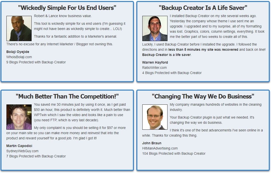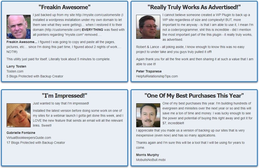 Set up your backup schedule one time and then let Backup Creator do the rest of the work for you. No files to upload, no cron jobs to setup, no FTP required. Just select your schedule and you're done.
