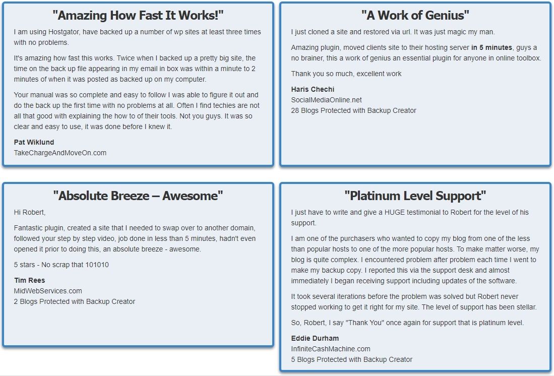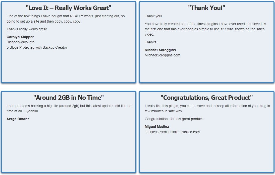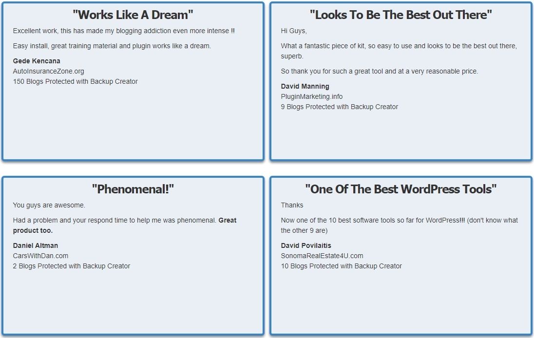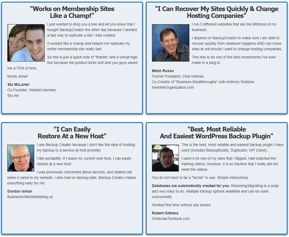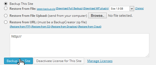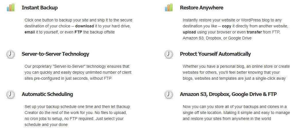 You decide where your WordPress site backs up to -- FTP, email, Amazon S3, Dropbox, Google Drive, Backup Creator cloud -- all in one click.